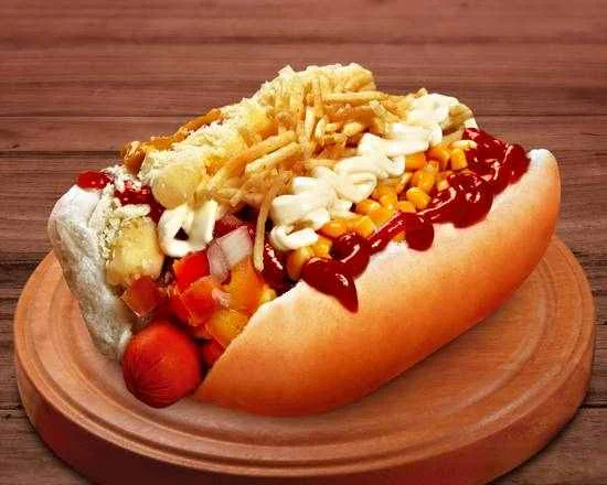 Dog LomboPão, Lombo Desfiada, 1 Salsicha, Molho de Tomate, Catupiry, Presunto, Banana Frita, Purê de Batata, Maionese Temperada, Vinagrete, Uva Passas, Ovo de Codorna, Ketchup Tradicional, Barbecue, Mostarda e Batata Palha.R$ 22,99